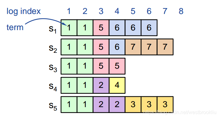 - 如果不同服务器上的某个日志项有着相同的 index 和 term(下图的第5项):