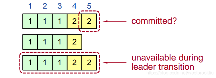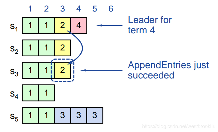 - 如果s5称为 leader,它将覆盖在s1、s2、s3的第3项日志